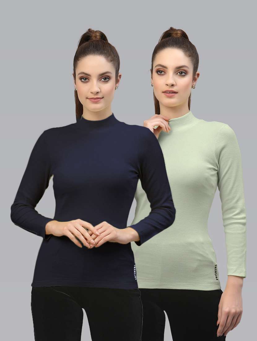 Navy Blue Pista Solid Casual Knitted cotton Rib Regular Length top for women direct manufectured by Friskers, Has a Turtle neck and Long sleeve.
