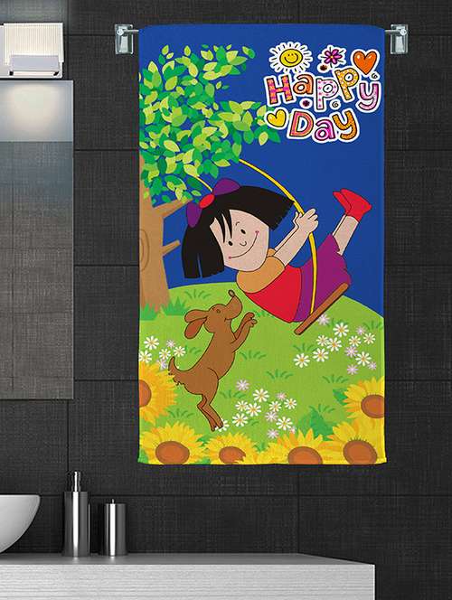 1100% cotton 300 gsm kids cartoon bath towel for bathroom set of 1pc, multicolor, 58 cm x 116 cm - color - blue swing girl