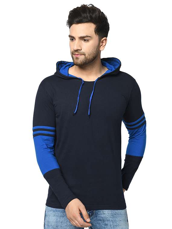 navy blue color block cut & sew hooded t-shirt