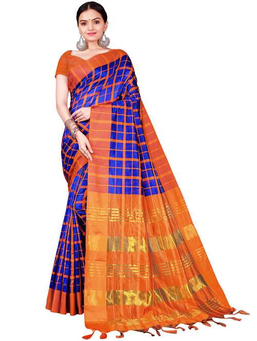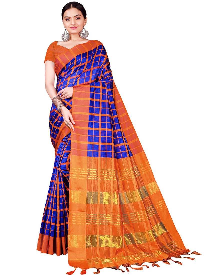 Be the cynosure of all eyes wearing this Blue and Orange coloured Checkered sarees from the house of Florence. Made of Cotton Silk , this saree will keep you comfortable throughout the day. The fine Work enhances the visual appeal of this Combo saree. each saree measures 5.5 m and it comes with a 0.80 m blouse piece.