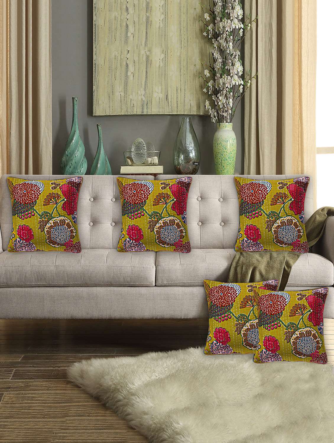 cotton kantha work fruit print cushion cover   - 16662816 - Very Small Image - 1