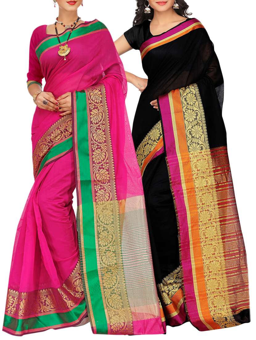 set of 2 zari bordered saree with blouse - 15484330 - Very Small Image - 1