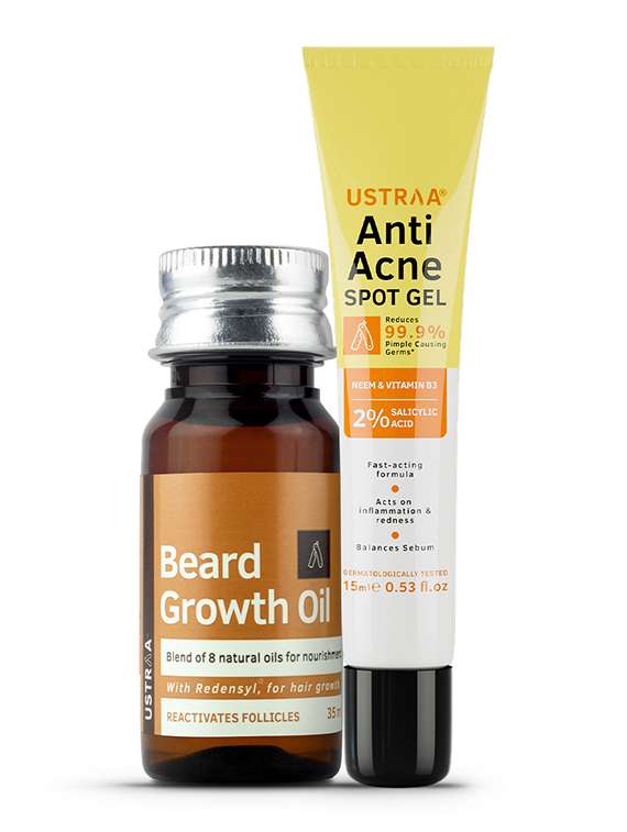 Ustraa Anti Acne Spot Gel - It's time to take the stubborn pimple head-on. This lightweight acne-fighting spot gel gets easily absorbed in the skin and unleashes the power of Salicylic Acid, Vitamin B3 and Neem to reduce inflammation, soothes irritation and also reduces post-acne hyper pigmentation. Beard Growth Oil - Beard deserves attention, not stress. We realized that a lot of our brothers are stressed with beard growth problems, and we took it as our own.We searched and found a breakthrough molecule that is natural and helps boost hair growth. Redensyl works on the hair follicle stem cells and promotes hair growth. We mixed it with 8 natural oils renowned for hair health and also empowered it with Vitamin-E. Backed by the research team and not by the marketing team, this product is what you have always looked for.Redensyl, Argan Oil, Almond Oil, Avocado Oil, Castor Oil, Acai Berry Oil, Olive Oil, Watermelon Seed Oil, Gooseberry oil, Vitamin-E form a Beard Bro gang, that fights all your beard growth worries.