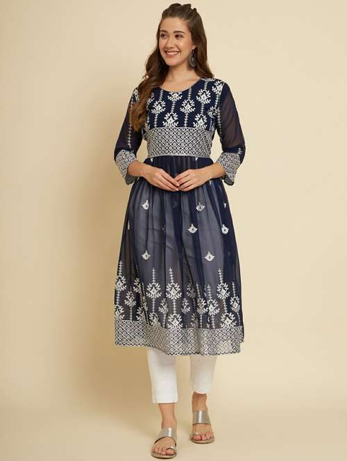 - Grab this beautiful kurta made up of georgette fabric featuring round neck designs.
