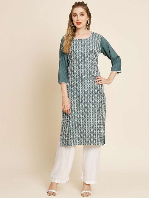 - Grab this beautiful kurta made up of georgette fabric featuring round neck designs.