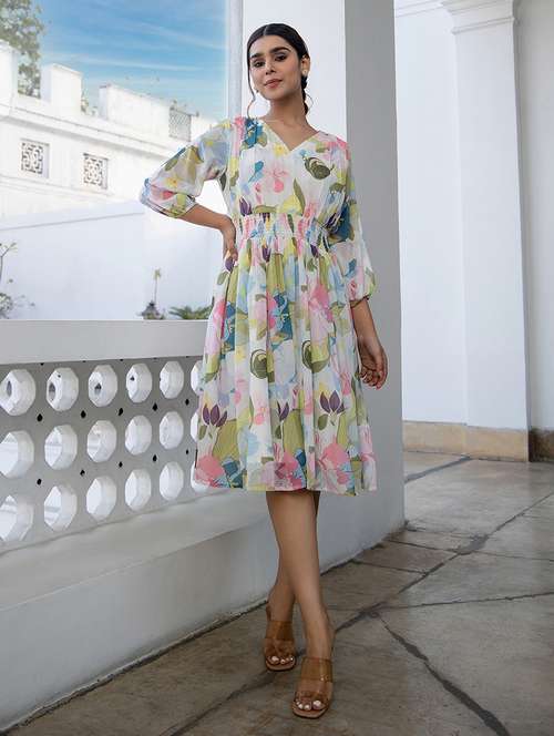 Elevate your casual party look with Janasya's Multicolor Floral Georgette Fit and Flare Dress. Featuring a V-neckline, puff sleeves, and ruching details at the waist, this midi dress is a perfect blend of playful elegance. Crafted for summer vibes, it's ideal for casual party wear, ensuring you stay stylish and comfortable with minimal accessories.