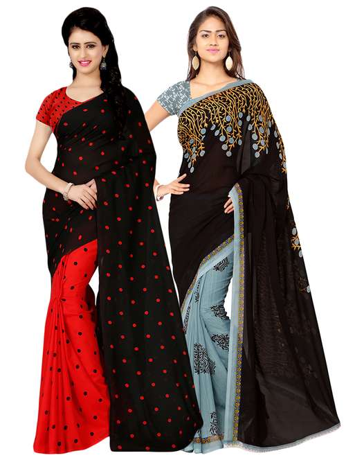 This is a pack of 2 Sari Collection made from Faux Georgette fabric ideal for women by Payal Sarees.This is a casual & Daily Wear collection designed in various printing methods in which multiple combinations of colors have been implemented in various printing patterns that gives beautiful look to these sarees.You will get 5.25 Meters saree having width of 1.12 meters and blouse 0.75 meters. New and Latest Faux Goergette made lightweight Collection of Sari in Pack of 2 units which is designed in beautifuly looking printed patters in good looking colors combinations ideal for daily and casual wear.We have such vast collection available at our online store in various printed patterns,Plain patterns,striped patterns and other printed designed likefloral,geometric graphic,paisely,polka dots and animal printing patters that makes this collection unique as Daily and Casual wear.