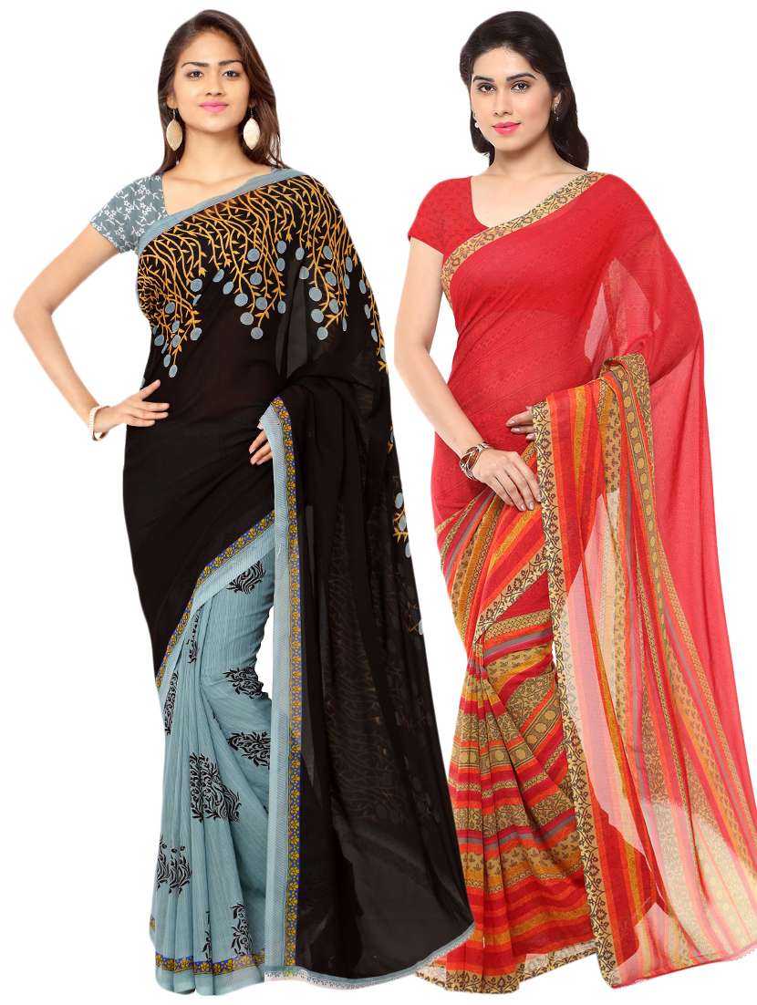 This is a pack of 2 Sari Collection made from Faux Georgette fabric ideal for women by Payal Sarees.This is a casual & Daily Wear collection designed in various printing methods in which multiple combinations of colors have been implemented in various printing patterns that gives beautiful look to these sarees.You will get 5.25 Meters saree having width of 1.12 meters and blouse 0.75 meters. New and Latest Faux Goergette made lightweight Collection of Sari in Pack of 2 units which is designed in beautifuly looking printed patters in good looking colors combinations ideal for daily and casual wear.We have such vast collection available at our online store in various printed patterns,Plain patterns,striped patterns and other printed designed likefloral,geometric graphic,paisely,polka dots and animal printing patters that makes this collection unique as Daily and Casual wear.