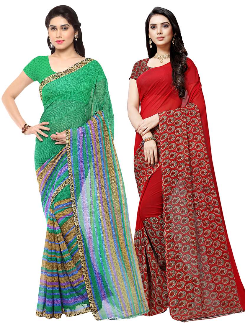 This is a pack of 2 Sari Collection made from Faux Georgette fabric ideal for women by Payal Sarees.This is a casual & Daily Wear collection designed in various printing methods in which multiple combinations of colors have been implemented in various printing patterns that gives beautiful look to these sarees.You will get 5.25 Meters saree having width of 1.12 meters and blouse 0.75 meters. New and Latest Faux Goergette made lightweight Collection of Sari in Pack of 2 units which is designed in beautifuly looking printed patters in good looking colors combinations ideal for daily and casual wear.We have such vast collection available at our online store in various printed patterns,Plain patterns,striped patterns and other printed designed likefloral,geometric graphic,paisely,polka dots and animal printing patters that makes this collection unique as Daily and Casual wear.