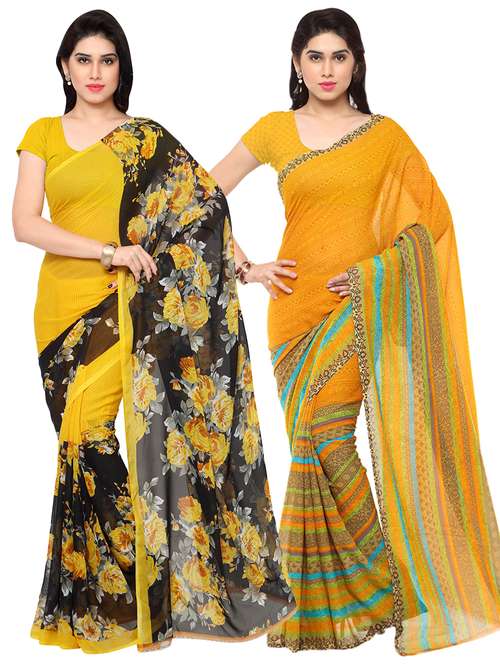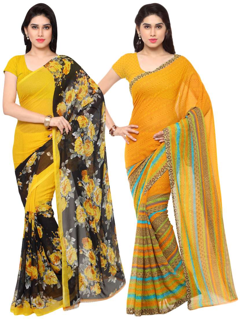 This is a pack of 2 Sari Collection made from Faux Georgette fabric ideal for women by Payal Sarees.This is a casual & Daily Wear collection designed in various printing methods in which multiple combinations of colors have been implemented in various printing patterns that gives beautiful look to these sarees.You will get 5.25 Meters saree having width of 1.12 meters and blouse 0.75 meters. New and Latest Faux Goergette made lightweight Collection of Sari in Pack of 2 units which is designed in beautifuly looking printed patters in good looking colors combinations ideal for daily and casual wear.We have such vast collection available at our online store in various printed patterns,Plain patterns,striped patterns and other printed designed likefloral,geometric graphic,paisely,polka dots and animal printing patters that makes this collection unique as Daily and Casual wear.