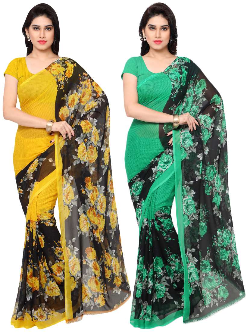 This is a pack of 2 Sari Collection made from Faux Georgette fabric ideal for women by Anand Sarees.This is a casual & Daily Wear collection designed in various printing methods in which multiple combinations of colors have been implemented in various printing patterns that gives beautiful look to these sarees.You will get 5.25 Meters saree having width of 1.12 meters and blouse 0.75 meters. New and Latest Faux Goergette made lightweight Collection of Sari in Pack of 2 units which is designed in beautifuly looking printed patters in good looking colors combinations ideal for daily and casual wear.We have such vast collection available at our online store in various printed patterns,Plain patterns,striped patterns and other printed designed likefloral,geometric graphic,paisely,polka dots and animal printing patters that makes this collection unique as Daily and Casual wear.