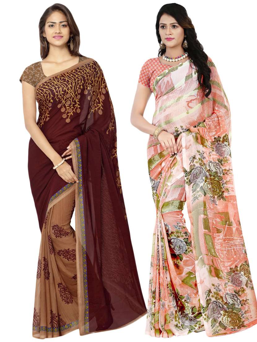 This is a pack of 2 Sari Collection made from Faux Georgette fabric ideal for women by Anand Sarees.This is a casual & Daily Wear collection designed in various printing methods in which multiple combinations of colors have been implemented in various printing patterns that gives beautiful look to these sarees.You will get 5.25 Meters saree having width of 1.12 meters and blouse 0.75 meters. New and Latest Faux Goergette made lightweight Collection of Sari in Pack of 2 units which is designed in beautifuly looking printed patters in good looking colors combinations ideal for daily and casual wear.We have such vast collection available at our online store in various printed patterns,Plain patterns,striped patterns and other printed designed likefloral,geometric graphic,paisely,polka dots and animal printing patters that makes this collection unique as Daily and Casual wear.
