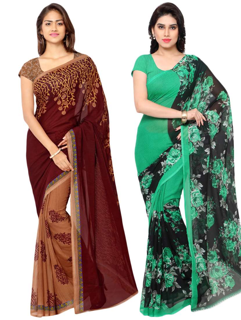 This is a pack of 2 Sari Collection made from Faux Georgette fabric ideal for women by Anand Sarees.This is a casual & Daily Wear collection designed in various printing methods in which multiple combinations of colors have been implemented in various printing patterns that gives beautiful look to these sarees.You will get 5.25 Meters saree having width of 1.12 meters and blouse 0.75 meters. New and Latest Faux Goergette made lightweight Collection of Sari in Pack of 2 units which is designed in beautifuly looking printed patters in good looking colors combinations ideal for daily and casual wear.We have such vast collection available at our online store in various printed patterns,Plain patterns,striped patterns and other printed designed likefloral,geometric graphic,paisely,polka dots and animal printing patters that makes this collection unique as Daily and Casual wear.