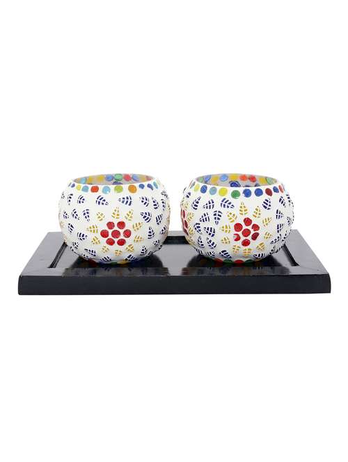 hand crafted glass votives with wooden tray