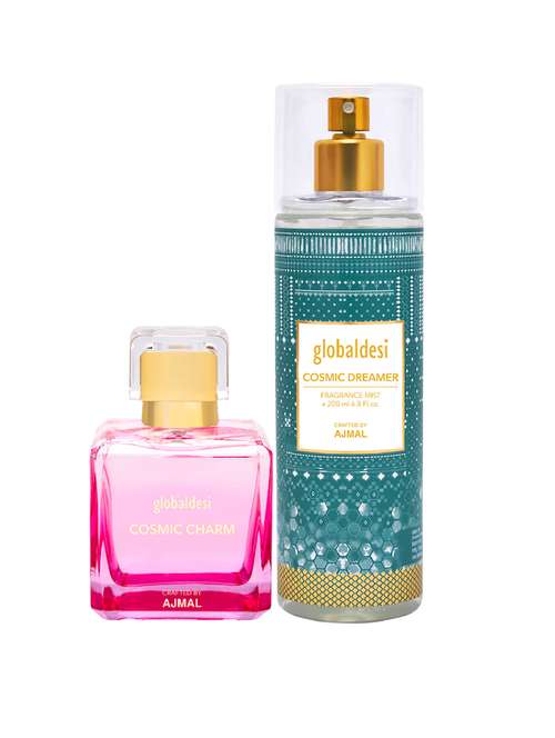 global desi cosmic charm eau de parfum 100ml & cosmic dreamer body mist 200ml pack of 2 for women + 2 parfum testers