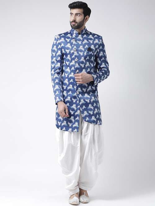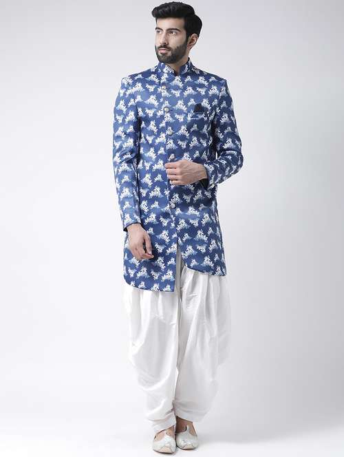 blue printed sherwani set