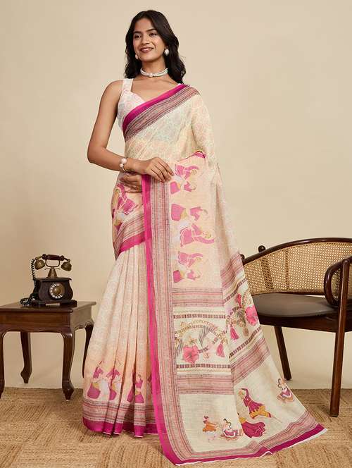 Multi LINAN SAREE WITH JARI BORDER ALL OVER SINGL COLOUR PRINTED WITH BLOUSE.