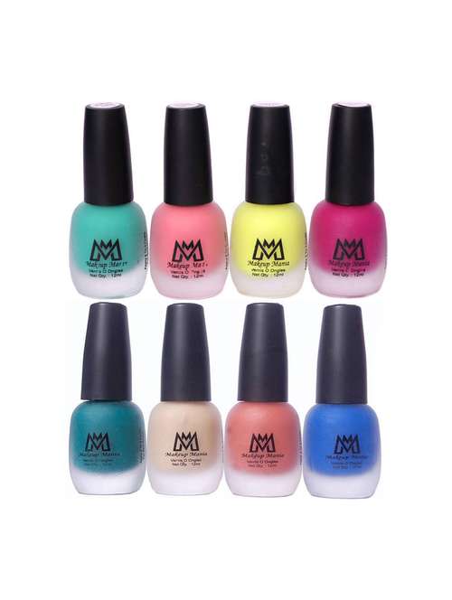 Makeup Mania nail polishes are highly pigmented with 108 trend setting shades which makes the nails to look beautiful and bright, each one as distinct and individual as the most talked about shade names in the industry. It will glam up your look in one go and no more salon visits are needed, a perfect gift for festive occasion or any other day to your loved ones, these are available in the latest trendy colors with velvet matte, glossy, glitter, shimmer, matte and frost shine finish. Makeup Mania nail polish has unique feature of long lasting stay with intense finish. Shake well before use. So get your professional manicure right at home. This combo consists of 8 nail polishes, these nail enamels are packed with authentic glass bottles, long lasting and chip resistant formula. The perfect flat brush helps give a smooth coat in one go. These enamels can be removed by any nail paint remover and it's as hassle free as it can be.