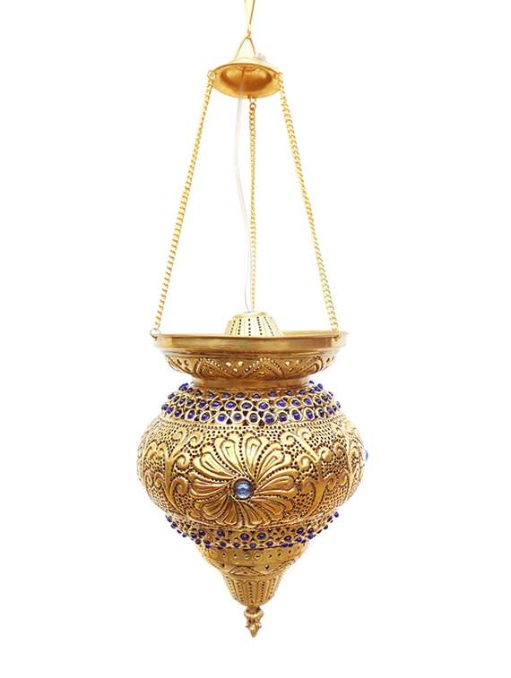 brass metal hanging lantern adorned with glass beads and intricate carving