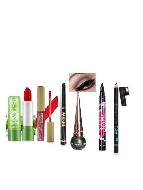 lipstick, sindoor, kajal, shimmer black zari eyeliner, pen eyeliner, eyebrow pencil