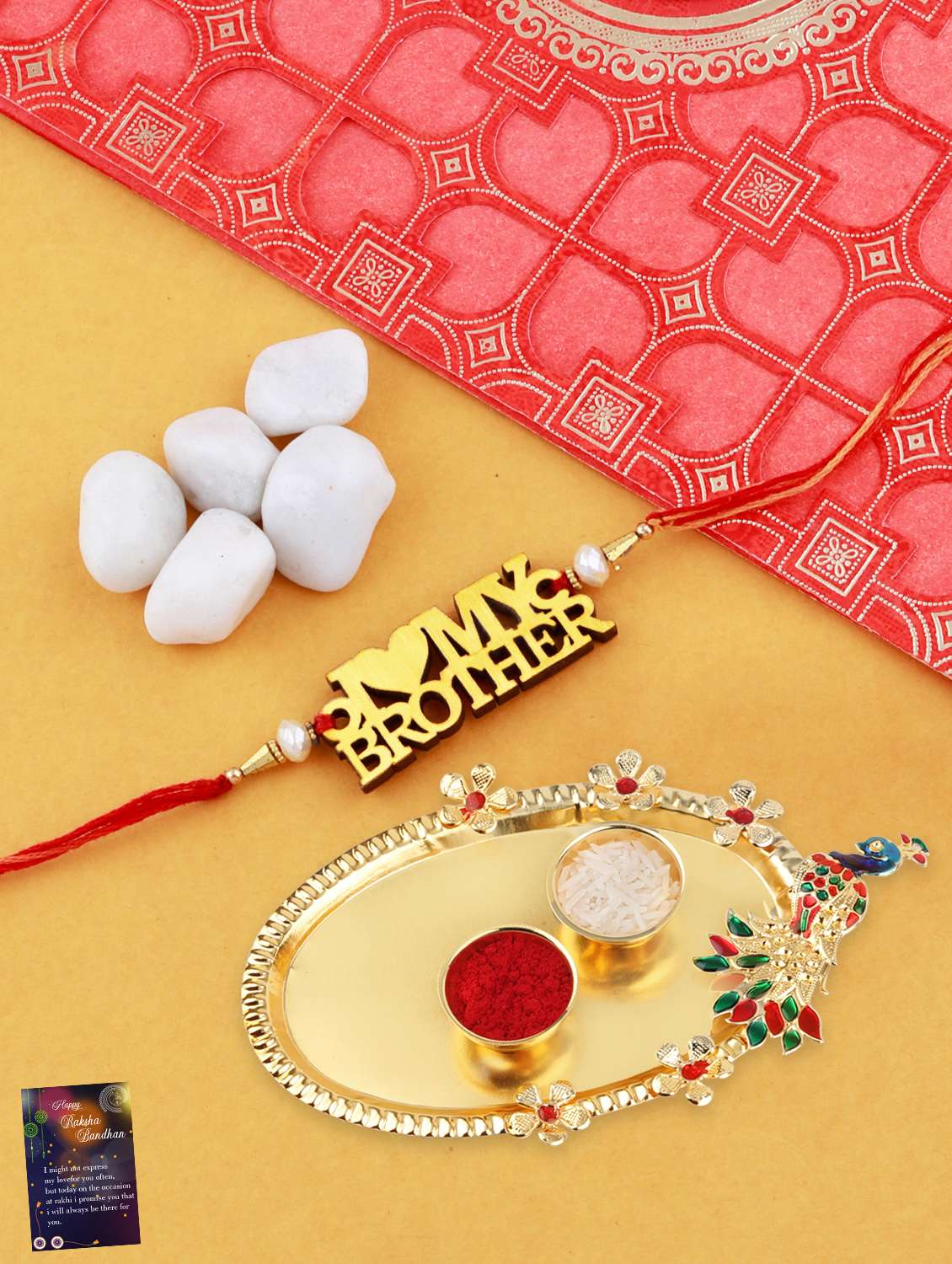 multi colored gold plated thread rakhi with roli chawal kankawati thali and greeting card