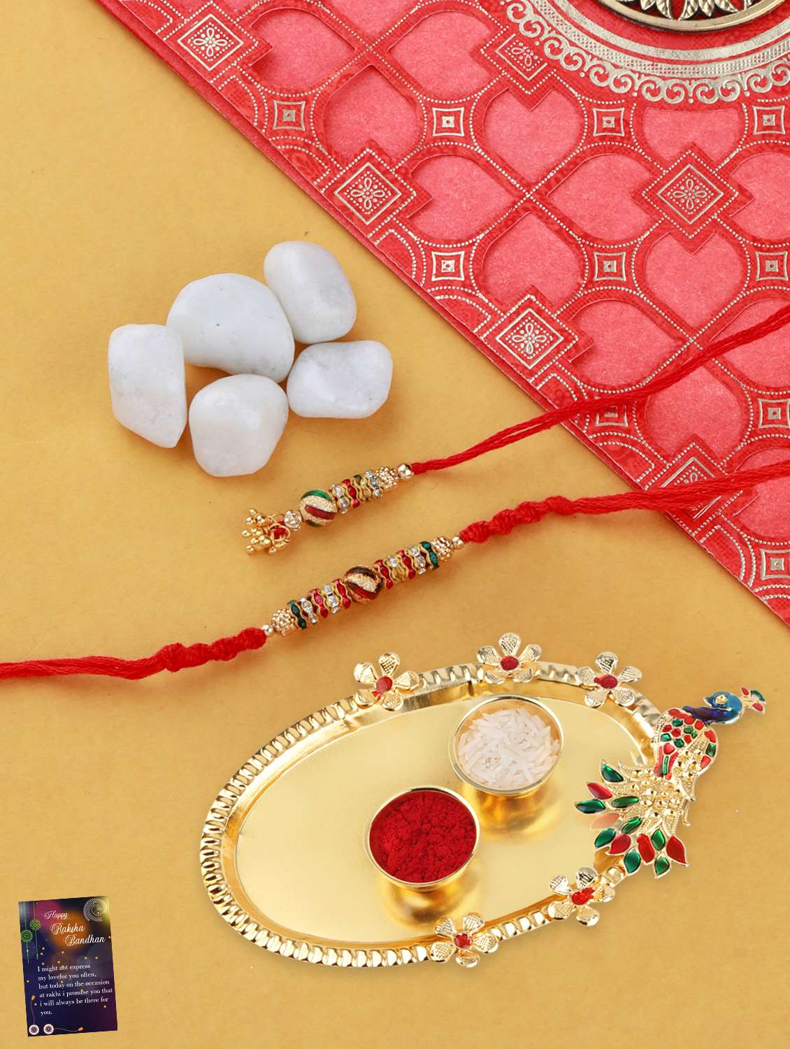 red handcrafted thread rakhi with roli chawal kankawati thali and greeting card
