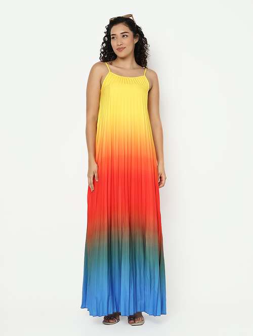 SHOWOFFFF Women's Multicolor Shoulder Straps Maxi Sleeveless Dress with Accordion Pleats