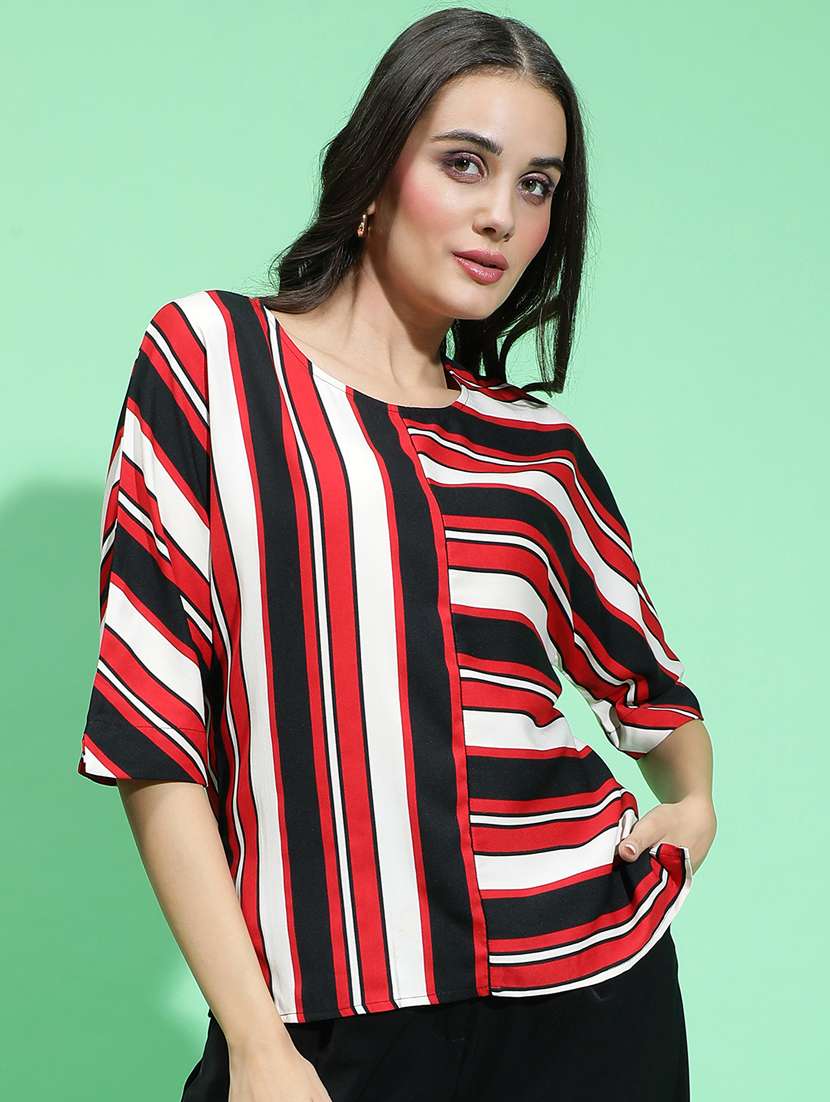 Just flaunt the cool casaul best look wearing this Youngly Multicolor Round Neck 3/4 Sleeve Stripe Print Women Top. Crafted from high-quality polyester, this top offers both style and comfort for any occasion. Featuring a classic round neckline and elegant 3/4 sleeves, this top exudes timeless charm with a modern twist. The colorful stripe print adds a playful touch, perfect for adding a pop of personality to your ensemble. Whether you're heading to the office or meeting friends for brunch, this versatile top pairs beautifully with jeans or trousers for a chic and effortless look. Embrace the bold and colorful side of fashion with our multicolor stripe print top, designed to make a statement wherever you go.