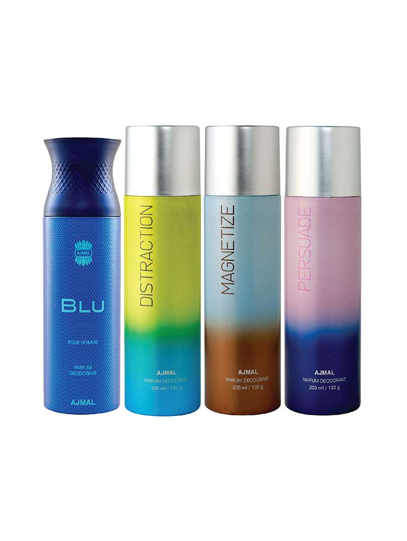 - » ajmal 1 blu for men, 1 distraction, 1 magnetize, 1 persuade for unisex deodorants combo pack of 4 (total 800ml) + 3 testers