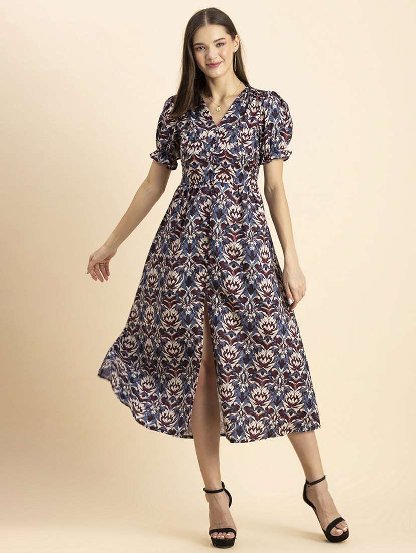 *Includes:This Clothing Consists Of 1 Dress (Any Accessories Worn By The Model Are Not For Sale)*Material:Poly Rayon*Dress Length:50 Inches (Approx.)*Model Stats:The Model In The Image Is 178 Cm Tall, And Bust 34\ Inches Is Wearing Size - (S) Small*Features:Front Slit, Buttoned, Puffed Sleeves, V-Neck, Styles Back, Calf Length, A-Line Hem, Lightweight And All Over Printed Pattern*Care:Dry-Clean Or Hand Wash In Cold Water With Mild Detergent, Air-Dry*Size Information:Please Refer To Our Size Chart Before Making The Purchase. If Your Size Is In Between Two Sizes, We Recommend That You Choose A Larger Size.*Tags:Printed Dress For Women, V-Neck Midi Dress, Puffed Sleeves Dress For Women, Resort Wear, Vacation Dress, Midi Dresses For Women, Western Dress, Front Slit Dresses For Women, Calf Length Dresses
