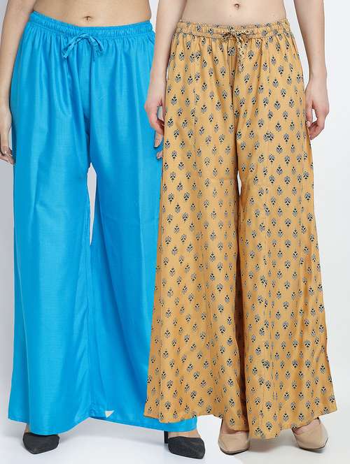 - Swirl your style and beauty in these combos palazzos available in a range of FREE SIZE sizes to make your ethnic wardrobe more elegant and convenient.