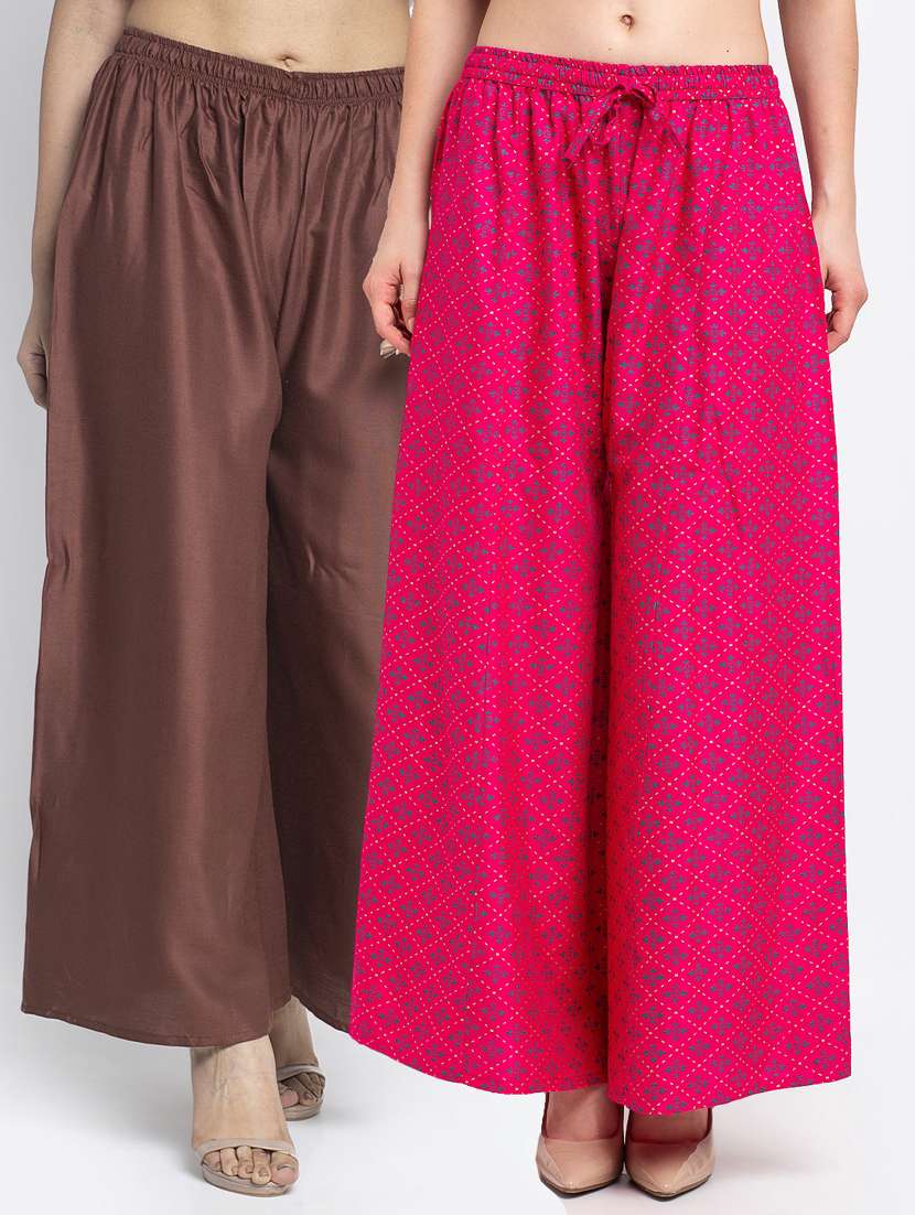 - Swirl your style and beauty in these combos palazzos available in a range of FREE SIZE sizes to make your ethnic wardrobe more elegant and convenient.