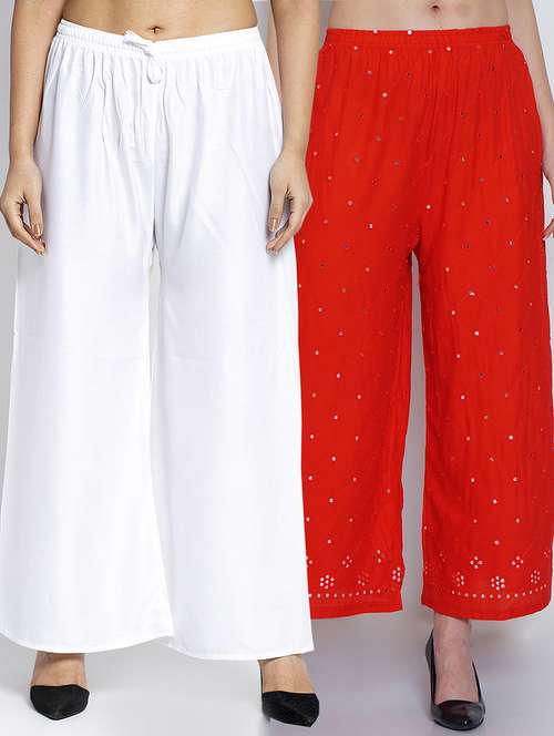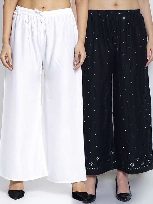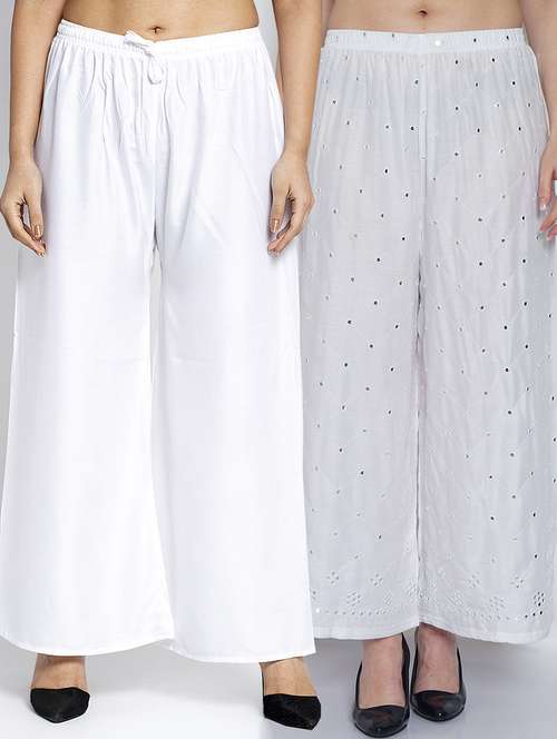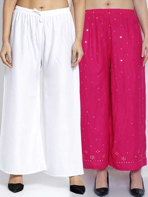 Women Rayon embroidery Print & Solid palazzo are a stylish piece of casual clothing. Featuring a mid-rise, soft, elasticated waistband - these palazzo promise a perfect and comfortable fit. Available in many shades, these pair well with indo-western tunics and Kurti.