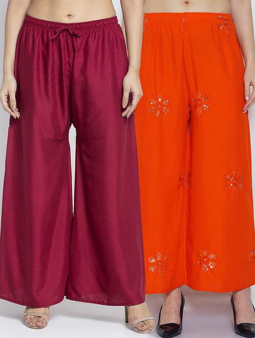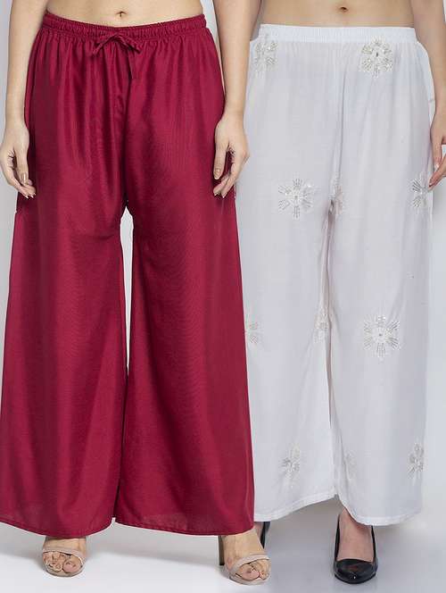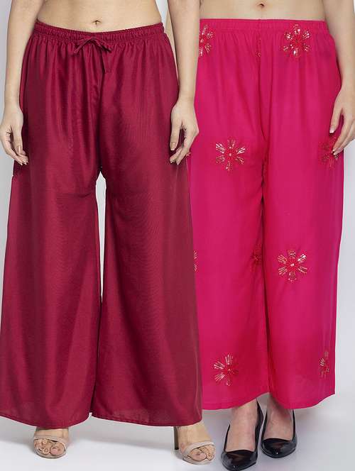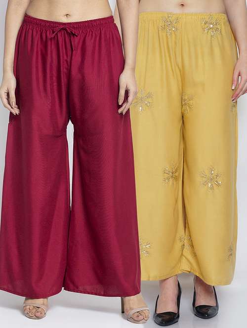 Women Rayon embroidery Print & Solid palazzo are a stylish piece of casual clothing. Featuring a mid-rise, soft, elasticated waistband - these palazzo promise a perfect and comfortable fit. Available in many shades, these pair well with indo-western tunics and Kurti.