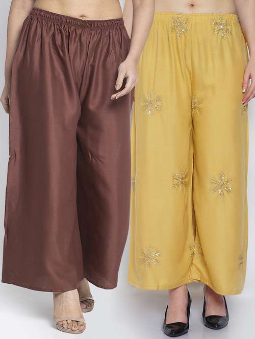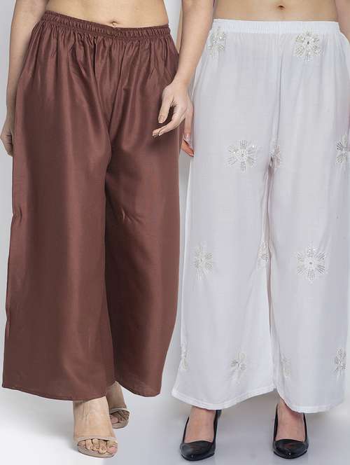 Women Rayon embroidery Print & Solid palazzo are a stylish piece of casual clothing. Featuring a mid-rise, soft, elasticated waistband - these palazzo promise a perfect and comfortable fit. Available in many shades, these pair well with indo-western tunics and Kurti.