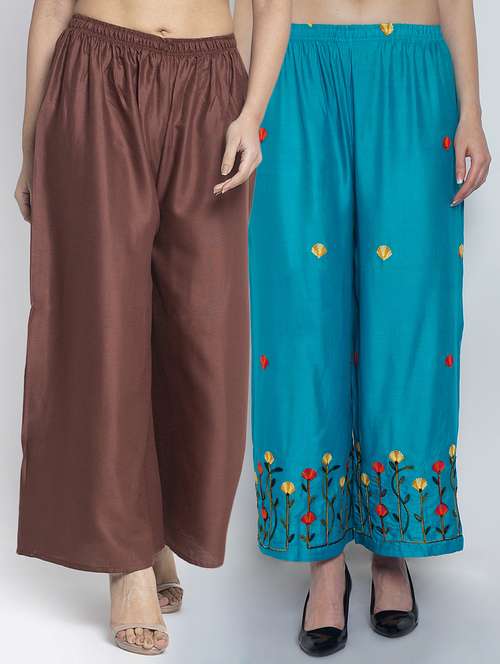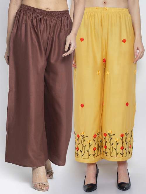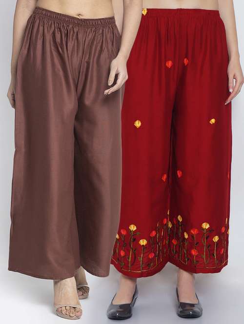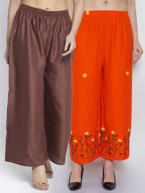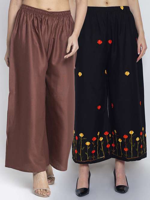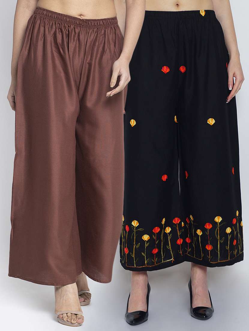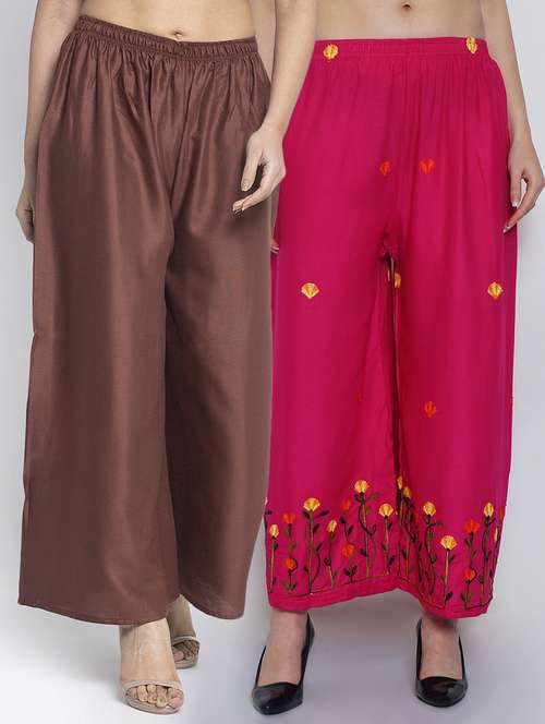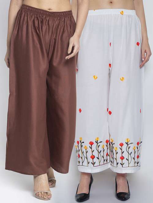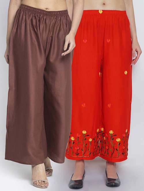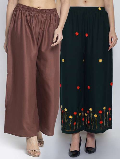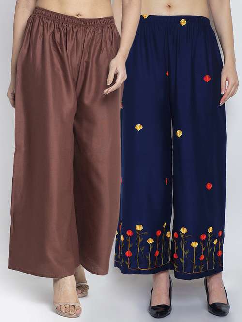 Women Rayon embroidery Print & solid palazzo are a stylish piece of casual clothing. Featuring a mid-rise, soft, elasticated waistband - these palazzo promise a perfect and comfortable fit. Available in many shades, these pair well with indo-western tunics and Kurti.