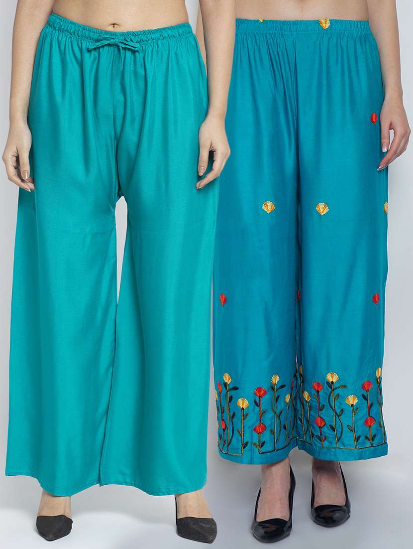 Women Rayon embroidery Print & solid palazzo are a stylish piece of casual clothing. Featuring a mid-rise, soft, elasticated waistband - these palazzo promise a perfect and comfortable fit. Available in many shades, these pair well with indo-western tunics and Kurti.