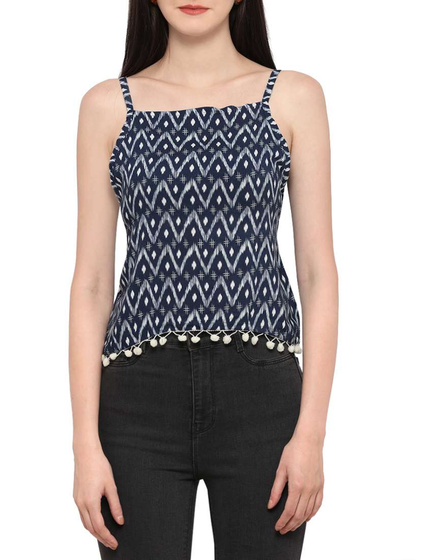 Look smart and fashionable by wearing this Indgo blue tank top. Pom-pom laces at bottom for women from Smarty Pants. Made from Rayon fabric, you can team this top with casual and denim pants of your choice to look trendy.
