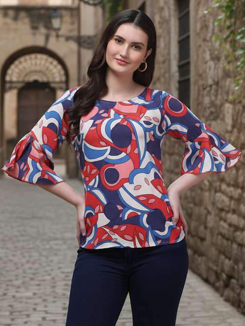 Step out in style with this vibrant multicolor abstract print top. Crafted from soft, breathable rayon fabric, this top offers a comfortable and flattering fit for all-day wear. It features a classic round neckline and trendy three-quarter length flared bell sleeves, adding a playful yet sophisticated touch to your look. The unique, bold pattern makes it a versatile piece for casual outings or smart-casual events.