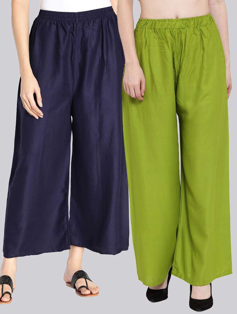Pack of 2 Flared Women Light Green and Navy Blue Viscose Rayon Palazzo