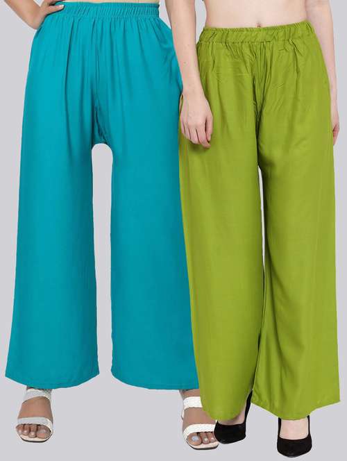 Pack of 2 Flared Women Light Green and Turquoise Blue Viscose Rayon Palazzo