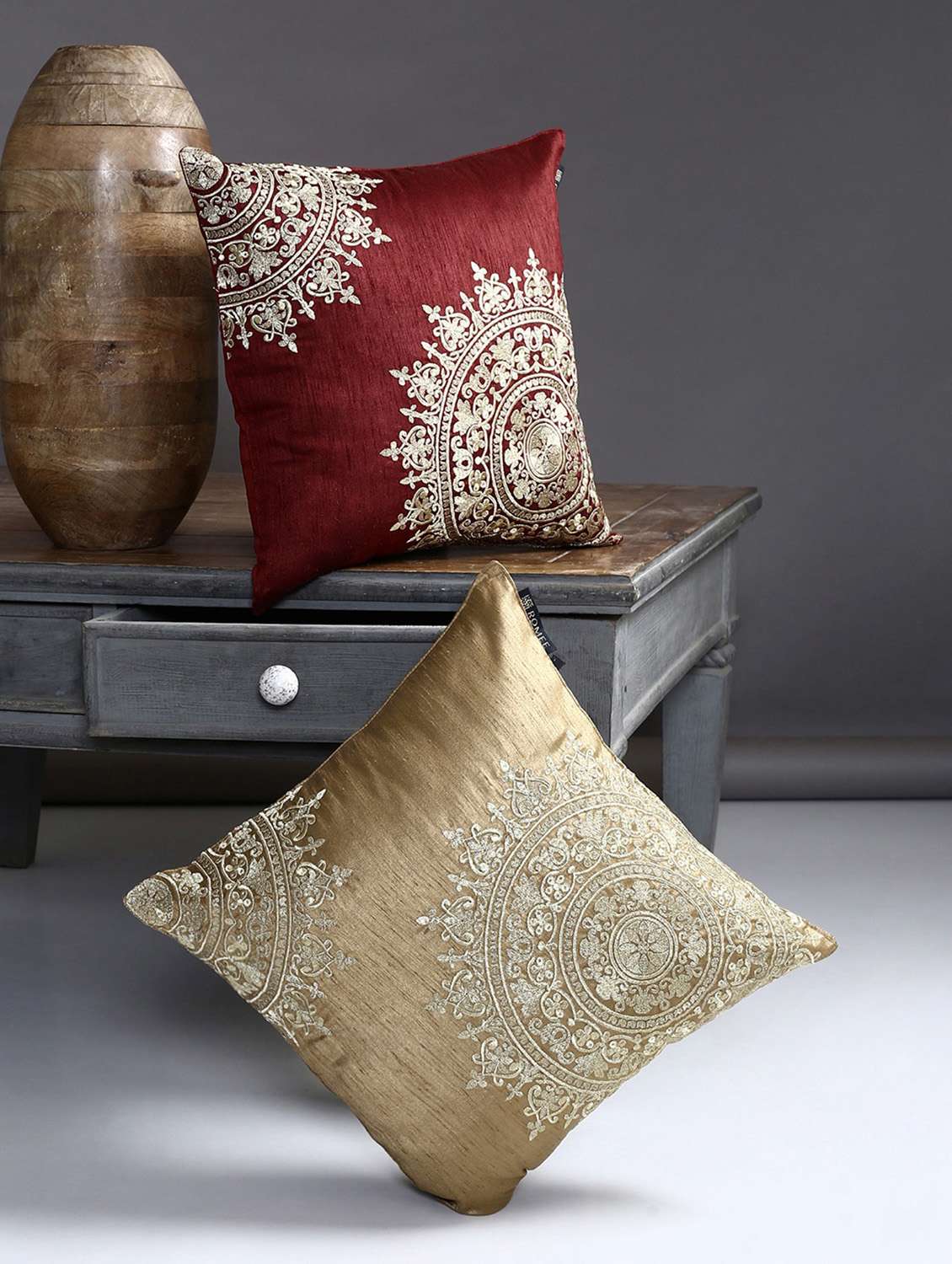 romee polyester embroidered cushion cover 16" x 16" set of 2 - maroon & beige