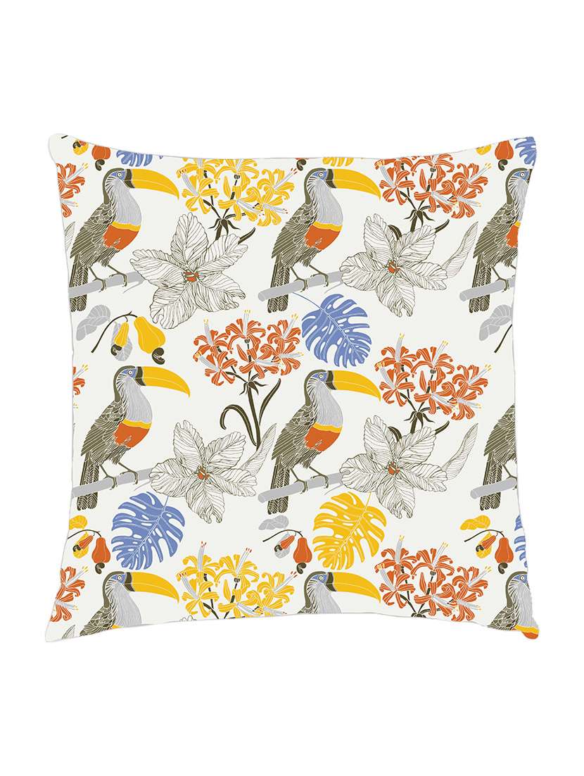 - » digitaly printed cushion cover of a bird with yellow tropical leafs.