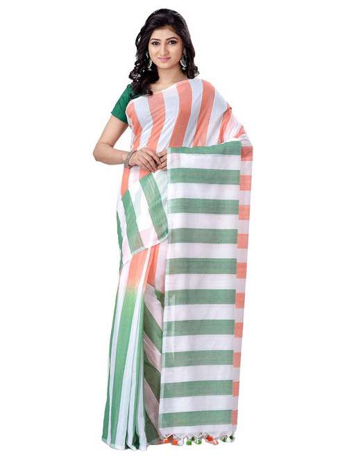 Explore the collection of beautifully Bengal Traditional Tant/Tangail Handloom Cotton Saree of West Bengal designed sarees from Desh Bidesh. Each piece is elegantly crafted and will surely add to your wardrobe. Pair this piece with heels or flats for a graceful look. Material: Handmade Cotton Handloom Cotton ; Saree Length: 6.3 m or Free Size With Blouse Pcs.; The color may vary due to screen setting . This Cotton sarees are evergreen sarees which never go out of style, especially in those parts of India where the heat becomes unbearable in the summer months and specially for india flag color saree, tri color saree and specially indian. This saree will give you a very ethnic and attractive look. This saree is made with 100% pure cotton and use muslin handloom cotton saree with Smooth Cotton and Bengal Soft Khadi Cotton Handloom Saree With Blouse Piece all over the saree. Saree border is made by cotton thread. We had given light starch in this cotton tant saree so that you can fold patli perfectly. The saree comes with a broad Borders. Which is well suited for a perfect traditional look. The saree comes with a blouse piece which is similar to the shade of the saree. It is unstitched and can be altered according to your fit and style that you require. Wash care: 1st Dry Wash then hand Wash only cold water Fabric: Pure Cotton with Muslin Cotton ; Length: 6.3 meter Set Content: With Blouse Piece Care Instructions: Dry Clean Only Wash Care : Dry Wash Only, Don’t Bleach .