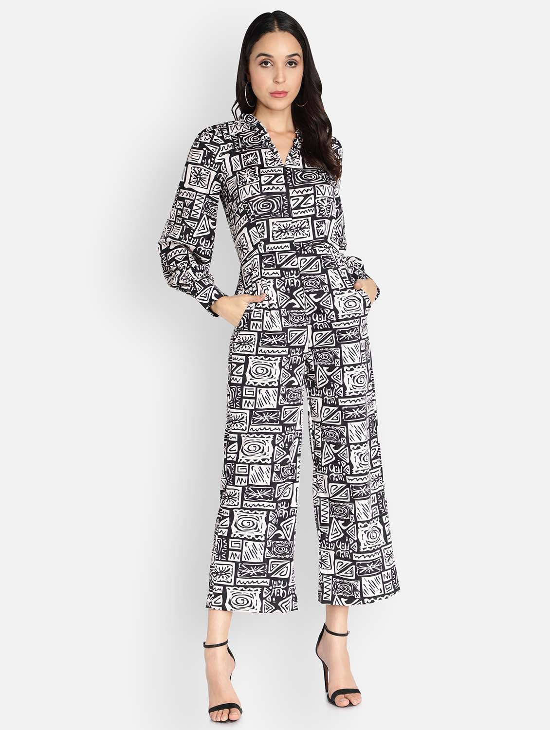shirt collar printed full leg jumpsuit