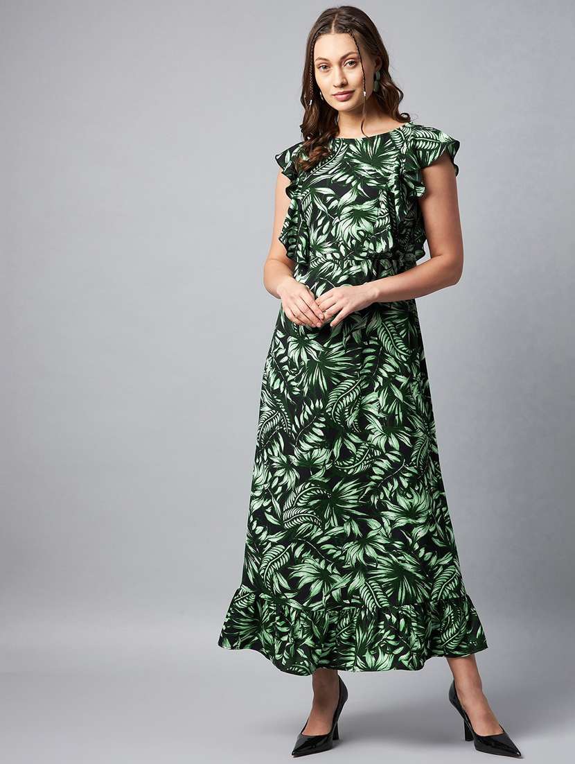 StyleStone Women's Green Leaf Printed Maxi Dress