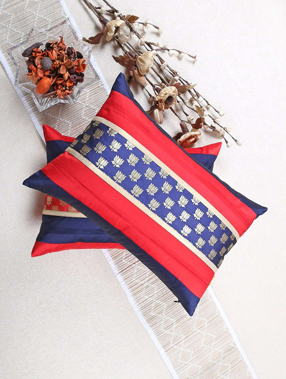 - » set of 2 red lotus brocade cushion cover with pleats
