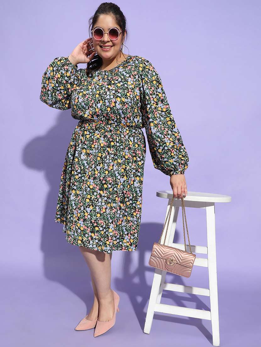 Demand the attention wearing this Starlit multicolor floral print round neck long sleeve elasticated flare plus size women dress – a fierce and comfy statement piece. With its eye-catching floral print, long sleeves, round neck, and playful flare, it's both chic and cozy. The unique elasticated waist and tie-knot detail at the back add more attraction. Crafted from high-quality viscsoe for a must-have fashion-forward look. Complete your ensemble with accessories, heels, or a statement bag for head-turning style.