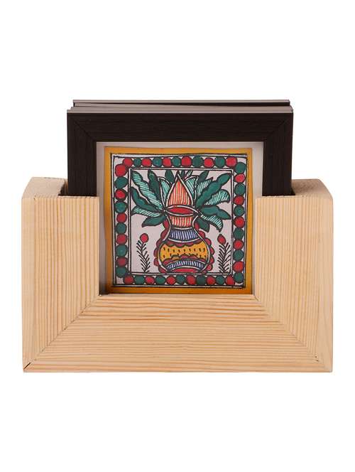 imithila madhubani wooden coasters set of 4 with stand of traditional matki in mithila folk art