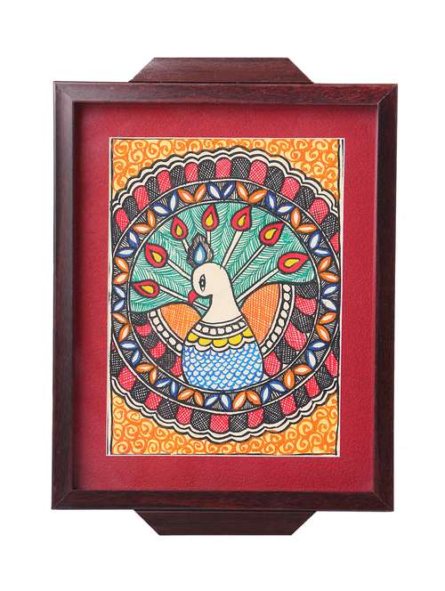 madhubani folk art decorative tray with peacock spreaded her feather
